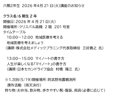 六期2年生 2026年4月21日(火)講座のお知らせ